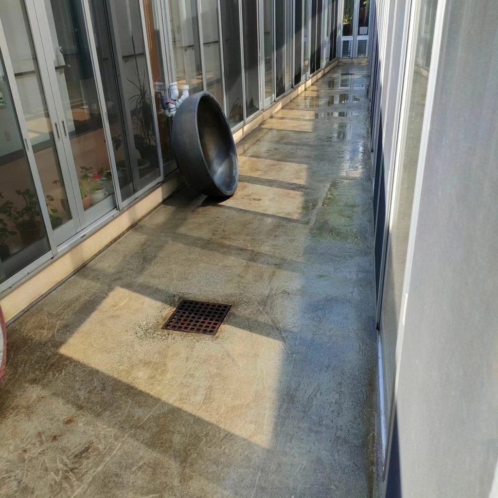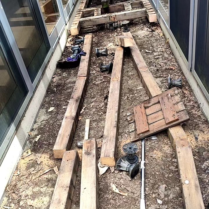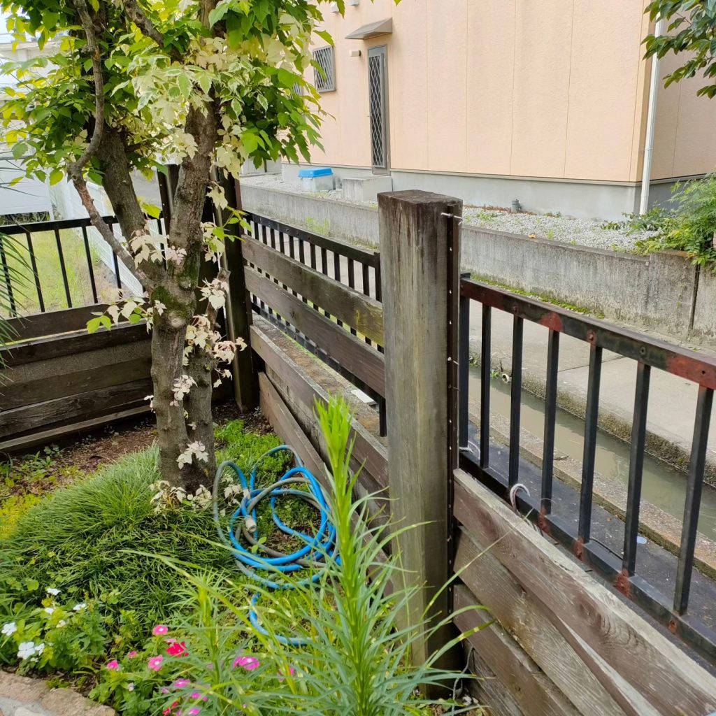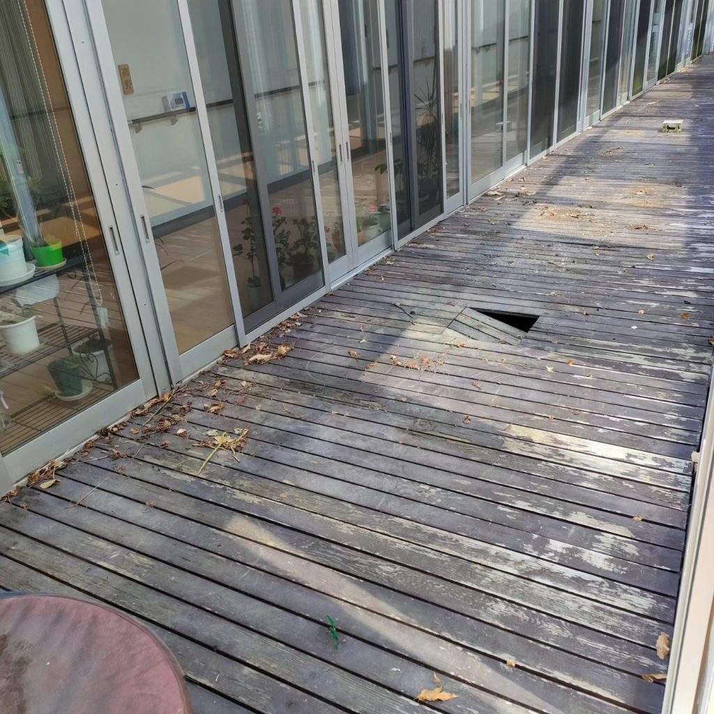 中庭のウッドデッキが経年劣化に伴う腐敗が進んでおり、危険と判断されご依頼頂きました。