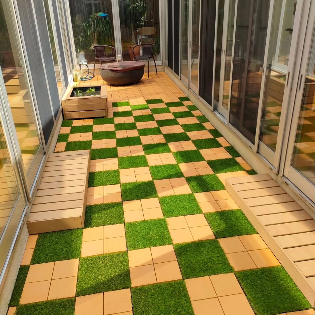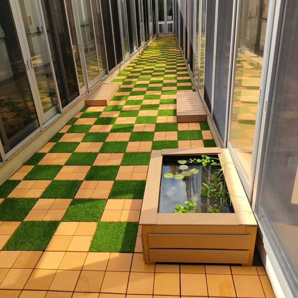 今回はプランを完璧に任されてしまったので、しばし時間を頂戴し…介護施設と言うことを踏まえた上で既存の足湯を残し、30cm角のタイルと人工芝を市松模様に敷いてみました。