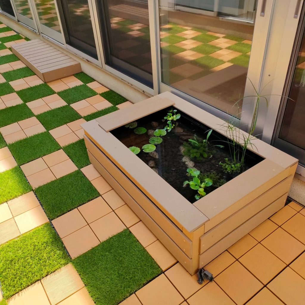 静かな中庭に、水生植物とさまざまな色のメダカの出現により、生命を感じてもらえたら嬉しいなと思い作成しました。囲いには人工木を使い、耐久性と雰囲気を確保しました。